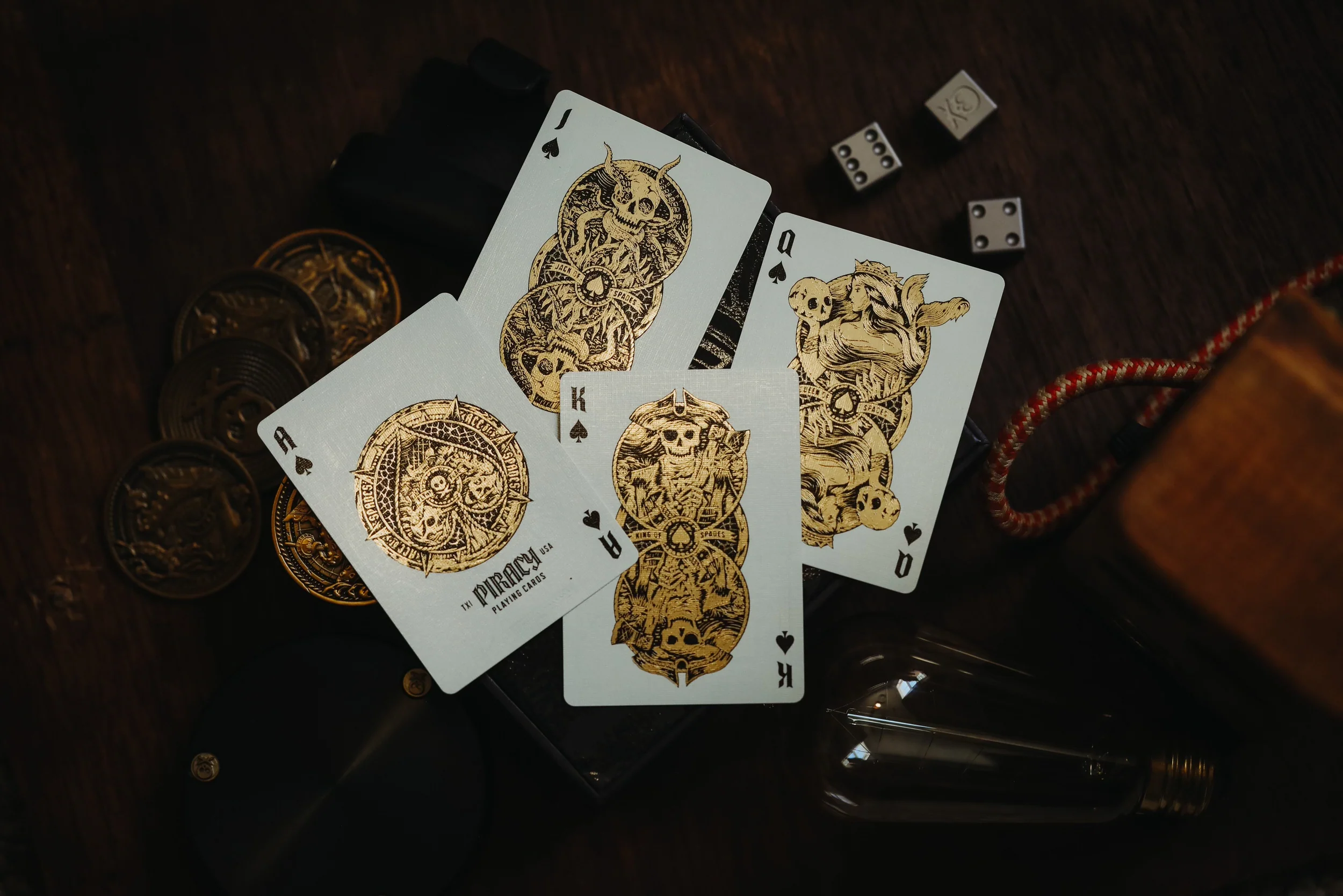 Piracy Playing Cards were produced using a dual-foil printing process - featuring both Gold AND Silver foil on the backs and faces of each card with extreme detail and precision. The design as a result is absolutely stunning - a lost treasure that’s finally been discovered.Fully Custom Artwork