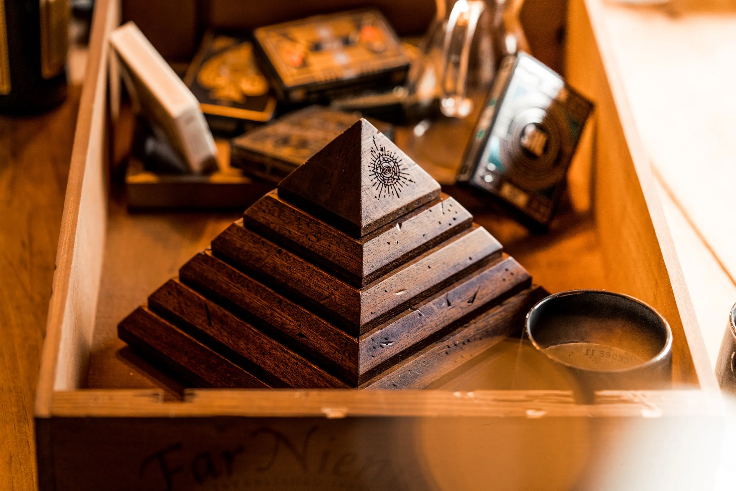 A pyramid puzzle box that when aligned correctly, swings open to reveal a secret compartment.
